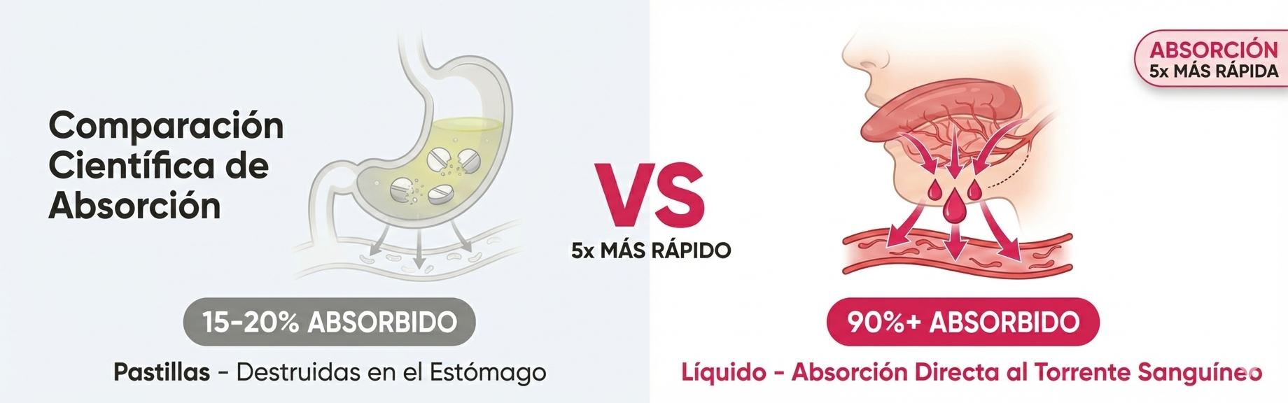 Las pastillas se destruyen en tu estómago antes de que tu cuerpo pueda utilizarlas. El formato líquido sublingual de Nutrilogy se absorbe directamente en tu torrente sanguíneo, evitando la digestión para una biodisponibilidad 5 veces mayor. Sientes la diferencia en días, no en semanas.