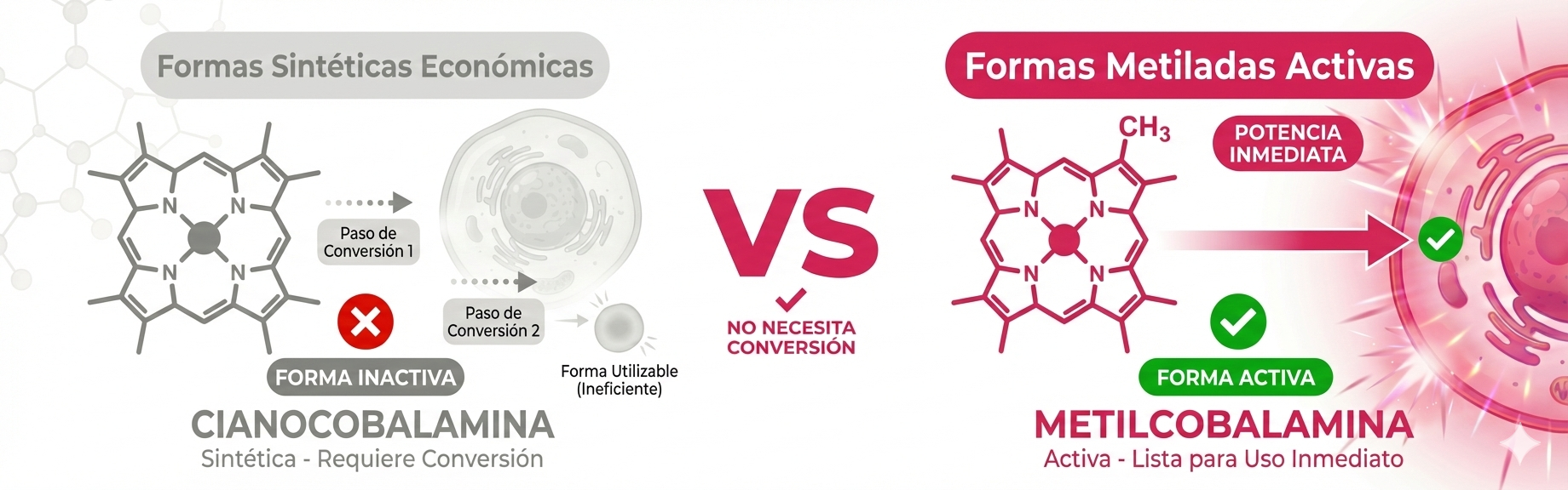 Los suplementos baratos usan formas sintéticas que tu cuerpo no puede procesar. Nutrilogy utiliza únicamente vitaminas B activas y metiladas, las formas exactas que tus células reconocen y utilizan de inmediato. No se necesita conversión. Máxima potencia desde el primer día.